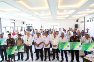 KABUPATEN CIREBON — Wakil Bupati Cirebon, Agus Kurniawan Budiman, secara simbolis menyerahkan kartu Badan Penyelenggara Jaminan Sosial (BPJS) Ketenagakerjaan kepada nelayan di Off-Room, Pendopo Bupati Cirebon, Rabu (10/9/2025).
